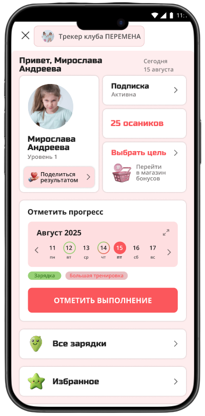 Мини-приложение, в котором вы отмечаете сделанные тренировки, отслеживаете прогресс, а ребенок копит баллы, которые потом меняет на настоящие подарки в клубном магазине.